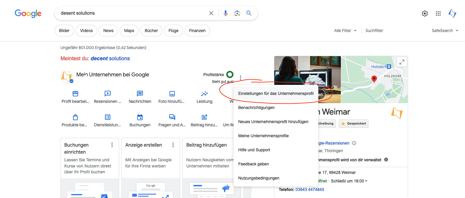 Suchen Sie nach Ihrem Google Business Eintrag und klicken Sie auf "Einstellungen für das Unternehmensprofil".