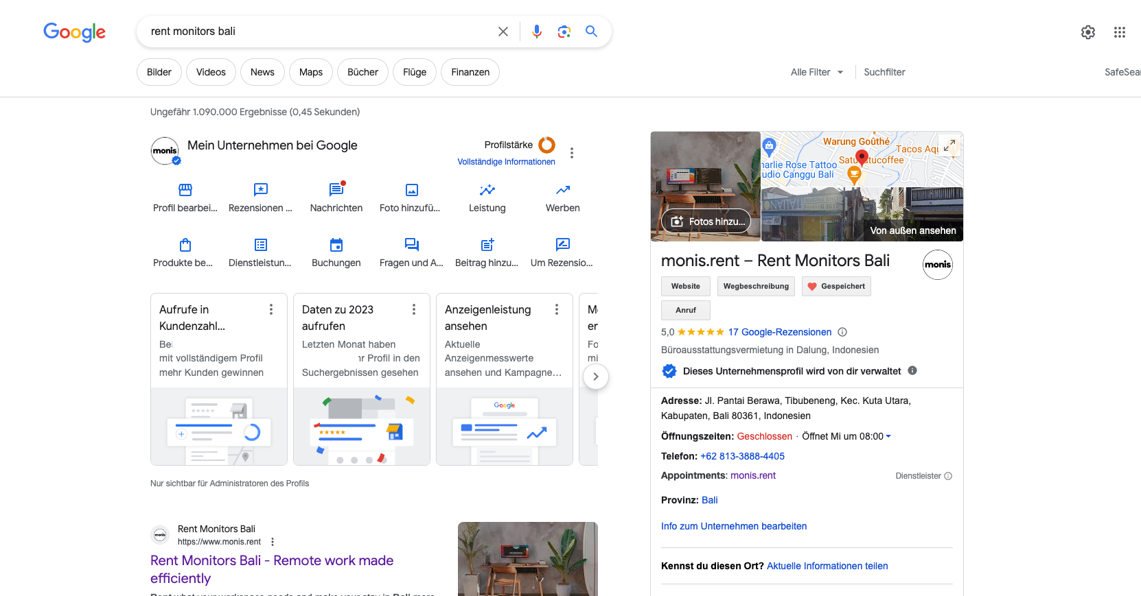 Für unseren Kunden, der international Büroausstattung vermietet, stehen wir in 12 Ländern immer an erster Stelle. Probieren Sie es gerne selbst aus! Geben Sie einfach "rent monitors Bali" oder "rent monitors Bangkok" in die Google-Suche ein. Dank des Google Business Eintrags konnte der Kunde die Neukundengewinnung, die über die Google-Suche kommen, um beeindruckende 40% steigern! 📈