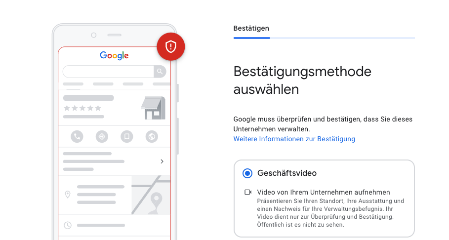 Die Bestätigung variiert je nach Art des Unternehmens. Bitte folgen Sie der Anleitung von Google. Seit Mai 2023 ist Google sehr strikt mit der Bestätigung. Es kann also passieren, dass Sie den Eintrag nur durch ein Video Ihres Geschäfts bestätigen können. 🎥